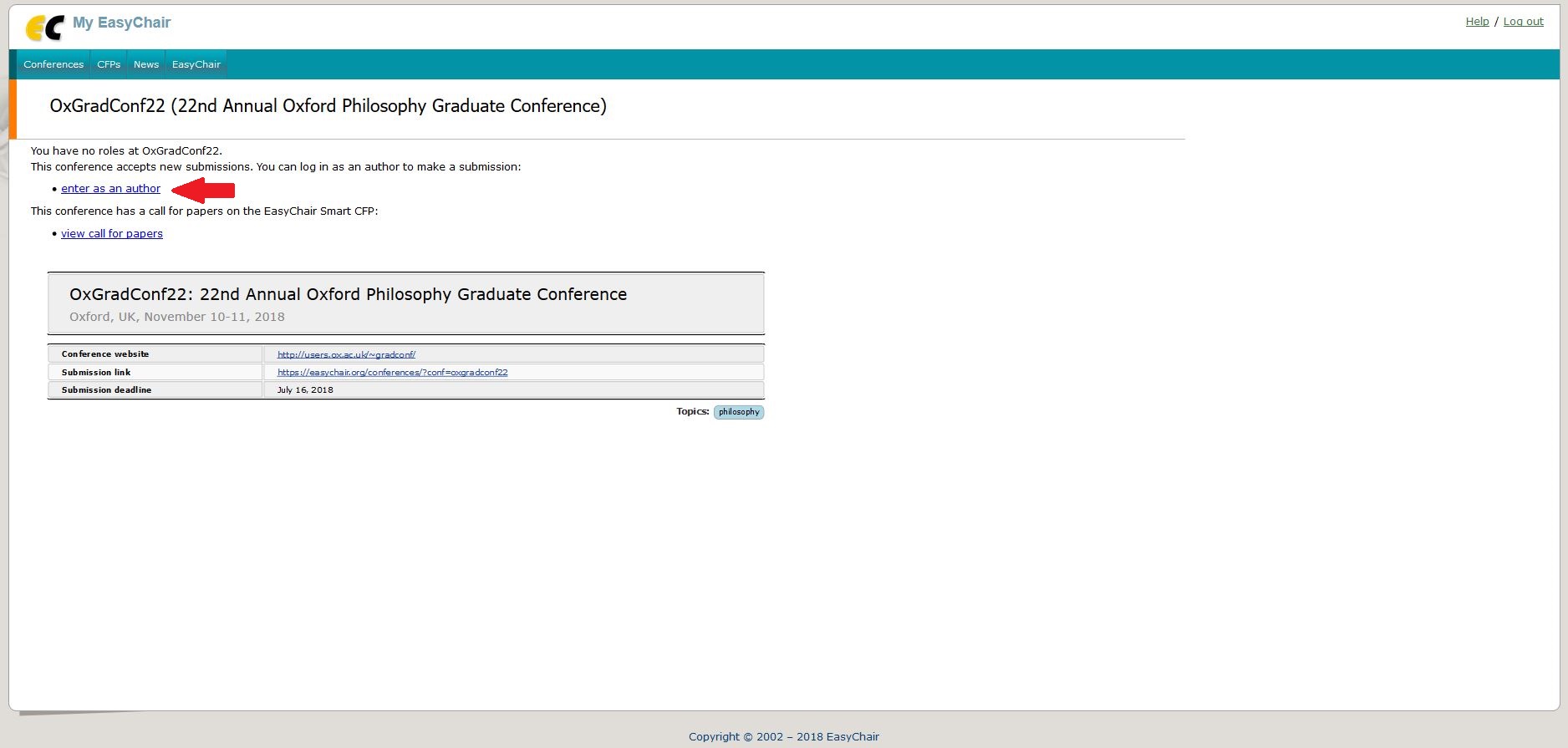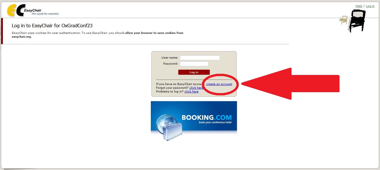 Click and hold on the images to see a bigger version.1. Visit the link https://easychair.org/conferences/?conf=oxgradconf23, and click on 'create an account'.